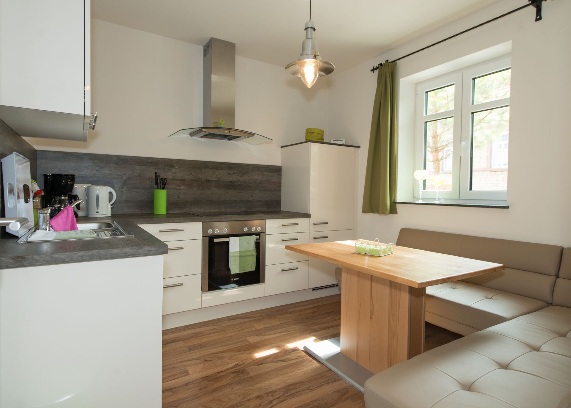 separate Küche, komplett ausgestattet: Kaffemaschine, Toaster, Wasserkocher, Spülmaschine, Backofen